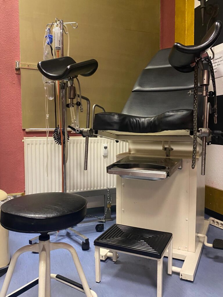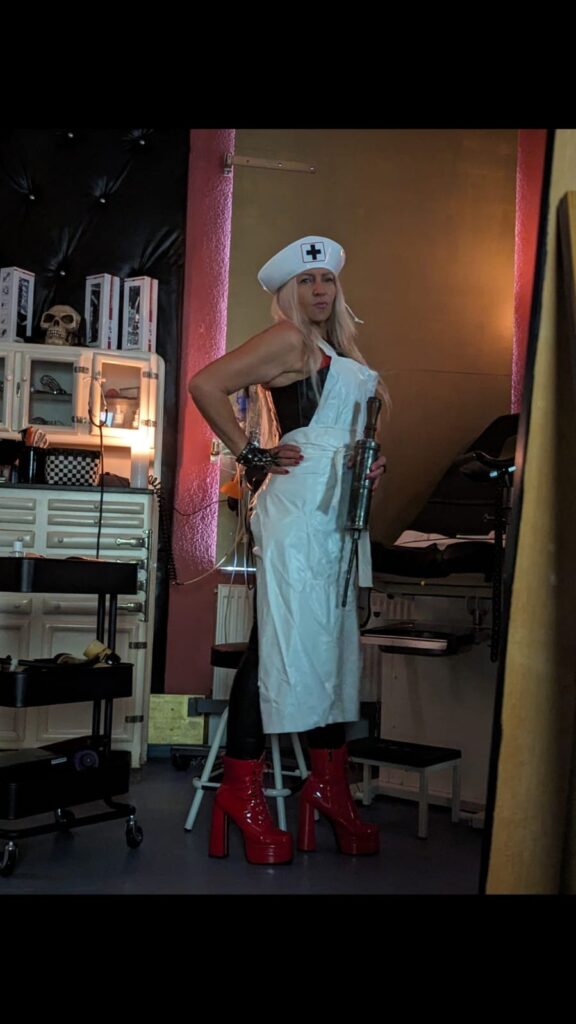 Klinik-Bereich Weiß, steril, präzise. Das Spannungsfeld zwischen Ausgeliefertsein und Kontrolle. Medizinische Instrumente, klinische Atmosphäre und eine Domina, die genau weiß, was sie tut.